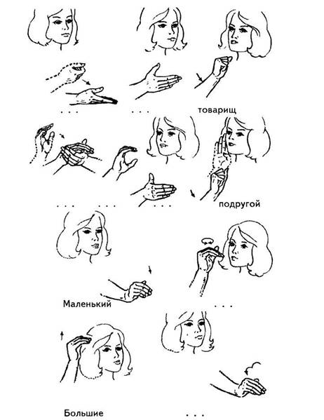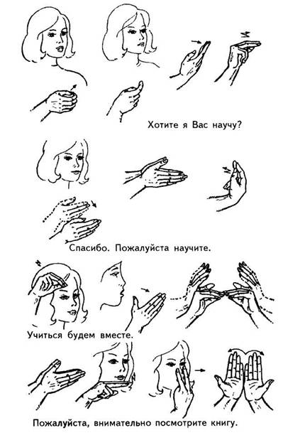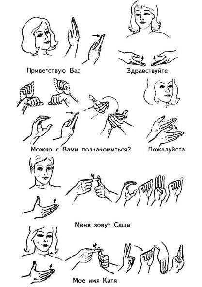 Стр. 19 Первая печатная книга появилась более 500 лет назад. 60. Покажите дактильно. Кого и почему называют отцом космонавтики? Кто и когда совершил первый полет в Космос? Кто впервые высадился на Луне? С какой скоростью летают спутники? Для чего они нужны? Самый быстрый пассажирский самолет обладает скоростью 2300 км в час. Самая большая скорость реактивного автомобиля более 1000 км в час. Задания. 1. Повторите знаки чисел первого и второго десятков, знаки обозначения сотен, тысяч, миллионов, миллиардов. 2. Подберите примеры с употреблением дробей, процентов и именованных чисел. 3. При переводе текстов и в диалогах постоянно используйте цифровой материал. РЕЧЕВЫЕ ЖЕСТЫДАВАЙТЕ ПОЗНАКОМИМСЯЗАНЯТИЕ СЕДЬМОЕЛЮДИЗАНЯТИЕ ВОСЬМОЕПокажите и переведите Упражнения. 61. Покажите жесты. Приветствую. Здравствуйте. Пожалуйста. Спасибо. Я. Вы. Мой. Вместе. Да. Нет. Знать. Не знать. Смотреть. Учить. Хорошо. Книга. 62. Скажите. Здравствуйте. Меня зовут ... . Я хочу с Вами познакомиться. Научите меня жестике. Я буду учиться хорошо. 63. Спросите. Как Вас зовут? Вы меня не знаете? Можно с Вами познакомиться? Вы хотите учить жестику? 64. Покажите жесты. Человек. Люди. Мужчина. Женщина. Мальчик. Де-вочка. Дети. Ребенок. Товарищ. Подруга. 65. Скажите. Человек идет. Женщина сидит. Мужчина стоит. Мальчик и девочка спят. Большой ребенок. Маленькие дети. Мужчина и женщина познакомились. Дети учатся хорошо. Мальчика зовут Володя, а девочку — Катя. 66. Спросите и скажите. Можно посмотреть Вашу книгу? Пожалуйста. Это хорошая книга. Вы знакомы с этим человеком? Нет, я его не знаю. -— Это мой товарищ. Мы вместе учились в ЛГУ. Кто эта женщина? Это моя подруга. Познакомьтесь, пожалуйста. Ее зовут Марина. — Это Ваши дети? Как их зовут? Максим и Денис. А у меня две девочки. Люде 7 лет, а Оле — 5. |