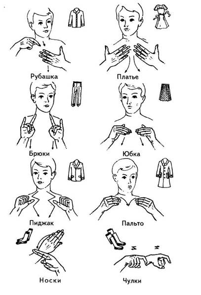 Стр. 32 РЕЧЕВЫЕ ЖЕСТЫОДЕЖДАЗАНЯТИЕ ДЕВЯТНАДЦАТОЕПокажите и переведите Упражнения. 121. Покажите речевые жесты. Рубашка. Платье. Брюки. Юбка. Пальто. Пиджак. Носки. Чулки. Перчатки. Шарф. Галстук. Белье. Купить. Продать. Стоить. Платить. Шить. Вязать. Стирать. Гладить. 122. Покажите речевыми жестами словосочетания. Оранжевая рубашка. Серая юбка. Синее платье. Красный галстук. Чистое белье. Коричневое пальто. Новые перчатки. Светлые чулки. Теплый шарф. Гладить брюки. Стирать носки. Шить пиджак (костюм). Вязать шапку. Купить портфель. 123. Спросите и ответьте речевыми жестами. Сколько стоит костюм? Где Вы купили эту рубашку? Сколько Вы заплатили за платье? Где продают белье? Сколько времени у Вас шьют пальто? Сколько будет стоить эта работа? Где здесь можно погладить брюки? Где здесь продают детскую одежду? Кто связал Вам это красивое платье? Кто сделал этот отличный рисунок? Какой галстук нужно взять? Какие у Вас есть перчатки? Как правильно почистить юбку? Как сдать белье в стирку? 124. Переведите речевыми жестами. Мать связала сестре теплое платье. Отец подарил мне красивый костюм. Подруге понравились шарф и перчатки. Вася пошел в школу с новым портфелем. Задание. Запишите жесты по теме: «Одежда». Повторите их во фразах, Составьте тексты для разговора и переведите их на жестику. |