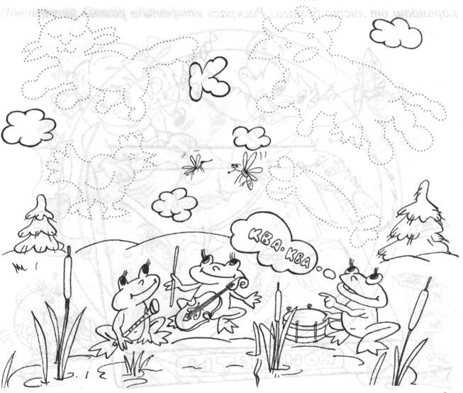 Стр. 2 ДОЖДИКПослушай и повтори. Дождик, дождик, веселей! Капай, капай, не жалей! Кап! Кап! Кап!... Произнеси несколько раз: «Капли капают: кап-кап». Дорисуй цветными карандашами капли дождя. КУКУШКАОтгадай загадку. Кто на ёлке, на суку Счёт ведёт: «Ку-ку, ку-ку»? Попробуй произнести без запинки: «У лесной кукушки есть два кукушонка, забавных ребёнка». Проведи короткие сплошные линии по точкам, проговаривая: «Ку-ку». КВАКУШКИОтгадай загадку. Зелены мы, как трава Наша песенка: «Ква-ква». Как прыгает лягушка ? Прыг-скок, прыг-скок, прыг-скок. Повтори несколько раз: «Ква-ква». Рисуй и проговаривай: «Ква-ква, лягушка-квакушка». ОБЛАКАОтгадай загадку. Без крыльев летят, Без ног бегут, Без паруса плывут. (облака) На что похожи эти облака ? Обведи по точкам контуры облаков. Проговаривай звук [К] в словах: «Облако, конфета, кот, корова, курица». |