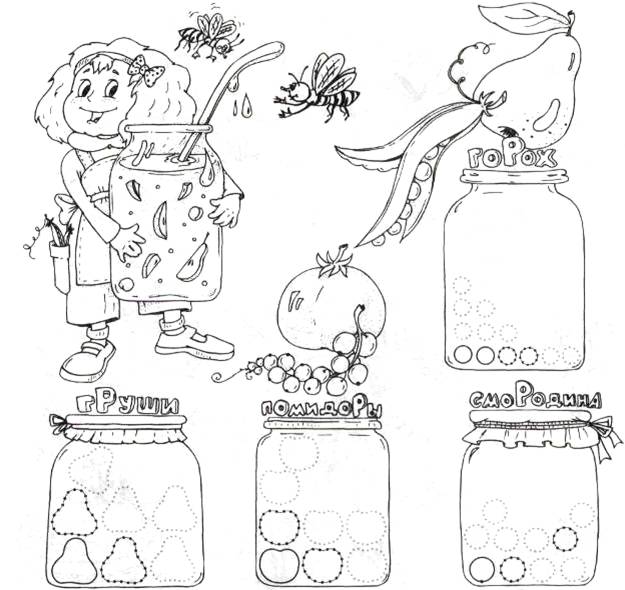 Стр. 5 РОСИНКИОтгадай загадку. Утром бусы засверкали, Всю траву собой заткали. А пошли искать их днём, Ищем, ищем — не найдём. (Роса) Повтори без запинки: «Росинки сверкают, сверкают росинки». Нарисуй по пунктирным точкам росинки, проговаривая чистоговорку, которую ты выучил. ГРАДОтгадай загадку, выучи её. На дворе переполох — С неба сыплется горох. (Град) Тучка рассердилась, разгневалась и посыпался из неё град. Нарисуй градинки, проговаривая слова: «Град, град...». ГРУШАОтгадай загадку. Висит шарик с бугорком, А внутри он с сахарком. (Груша) Проговори: «Груши собираем и в корзинку бросаем». Нарисуй груши на дереве, повторяя: «Груша, груша, грушка...». МАМИНЫ ПОМОЩНИКИВыучи стихотворение. На жарком солнышке подсох И рвётся из стручков горох. Маме помогаем, Горошек в банки закрываем. Много овощей, ягод и фруктов созрело. Надо сделать заготовки на зиму. Помоги маме сделать заготовки на зиму. Рисуем плоды в банках и проговариваем: «Горох, горошек...». Что мы ещё заготовили? |