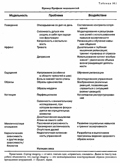 Стр. 343 Структурный профильСтруктурный профиль появляется в конце Мультимодальной анкеты истории жизни. Здесь клиентов просят оценить себя по каждой из модальностей BASIC I.D., используя 7-балльную шкалу; в этой шкале 1 балл соответствует самой низкой оценке, а 7 баллов — самой высокой оценке. Описания каждой модальности были даны в начале этой главы при знакомстве с семью модальностями BASIC I.D. Структурный профиль обеспечива ет получение полезной и для консультанта, и для клиента дополнительной информа ции о том, как клиент взаимодействует с миром. Это взаимодействие легко предста вить в виде диаграммы. В дополнение к включающей семь вопросов Мультимодальной анкете истории жиз ни Лазарус составил стандартизированную Структурно-профильную анкету (SPI), которая содержит 35 пунктов и образует Приложение 4 в книге Лазаруса (Lazarus, 1989с). SPI оказалась очень полезной при консультировании супружеских пар. Про фили позволяют точно установить причины отсутствия взаимопонимания и делают возможными плодотворное обсуждение и принятие оптимального решения. Иногда про фили показывают, что консультирование по проблемам развода — более реалистичес кая перспектива, чем консультирование по проблемам брака, например, если один парт нер в наибольшей степени ценит выражение эмоций и межличностную близость, а его отношение к поведению и когнициям характеризуется нижней отметкой, в то время как другой партнер имеет «противоположный» профиль. |