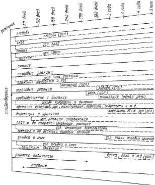 Часто возбудителем интегрированной реакции является словесный (вербальный) стимул. Всякий словесный приказ является таким именно стимулом. Таким образом, самые сложные наши привычки могут быть представлены как цепи простых условных реакций. Бихевиоризм заменяет поток сознания потоком активности, он ни в чем не находит доказательства существования потока сознания, столь убедительно описанного Джемсом, он считает доказательным только наличие постоянно расширяющегося потока поведения. На приведенной схеме показано, чем бихевиоризм заменяет джемсовский поток сознания. На этой схеме перечислены (весьма неполно) действия новорожденного (непрерывные линии). Она показывает, что .реакции «любовь», «страх», «гнев» появляются при рождении так же, как чихание, икание, питание, движение туловища, ног, гортани, хватание, дефекация, выделение мочи, плач, эрекция, улыбка н т. д. Она показывает далее, что протягивание рук, мигание и т. п. появляются в более позднем возрасте. Из этой схемы становится также ясным, что некоторые из этих врожденных реакций продолжают существовать в течение всей жизни индивидуума, в то время как другие исчезают. Важнее всего то, что, как показывает схема (пунктирные линии), условные реакции всегда непосредственно надстраиваются па основе врожденных. Так, например, новорожденный ребенок улыбается 1(Б)Р/; поглаживание губ /(Б)С/ и других зон тела (как и некоторые внутриоргаиические стимулы) вызывает эту улыбку. Ситуацию при этой врожденной реакции можно представить следующим образом: (5) С (Б) С Черная непрерывная линия обозначает безусловную основу всякой системы поведения. Пунктирная линия показывает, как каждая система усложняется при образовании условных реакций