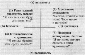 Стр. 33 2.3. Проблематичные отношения между повседневным "Я" и двойникомВажнейшие основные позиции по отношению к собственной тени, двойнику, могут быть описаны примерно так: (Таблица 2.4) Я снова выбираю форму разговора повседневного "Я" с темной и недружественной сущностью нашей личности. Табл. 2.4 Проблематичные основные позиции повседневного "Я" по отношению к тени. В следующих разделах эти позиции конкретизируются. (1) Позиция решительного укротителя зверей"О тень, как ты сильна! Ты угрожаешь меня подавить. Поэтому я буду начеку. Как только я почувствую во мне малейший признак твоей активности, я буду бороться с тобой, усмирять тебя и обуздывать! Затем я буду тебя укрощать и приручать! При малейшем сопротивлении ты почувствуешь мой гнев ". В своей деятельности консультанта я имел дело с одним очень уважаемым ученым. Он стал руководителем исследовательского отдела. При его позиции "научной бескомпромиссности", которая приводила его к успеху в естественнонаучных исследованиях, уже через короткое время он, как руководитель, потерпел фиаско. В результате он был очень недоволен собой и не мог себе простить своей слабости, и мучительно переживал свои ошибки. Для сотрудниц и сотрудников эта жесткая позиция была очень тяжелой, поскольку она затмевала в их шефе всякий позитивный элемент его характера. При такой позиции доминируют близость (Б) и активность (а). |