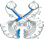 Рис. 1. Схема строения зрительного анализатора 1 - сетчатка, 2 - неперекрещенные волокна зрительного нерва, 3 - перекрещенные волокна зрительного нерва, 4 - зрительный тракт, 5 - наружнее коленчатое тело, 6 - radiatio optici, 7 - lobus opticus, Вокруг глаза расположены три пары глазодвигательных мышц. Одна пара поворачивает глаз влево и вправо, другая - вверх и вниз, а третья вращает его относительно оптической оси. Сами глазодвигательные мышцы управляются сигналами, поступающими из мозга. Эти три пары мышц служат исполнительными органами, обеспечивающими автоматическое слежение, благодаря чему глаз может легко сопровождать взором всякий движущийся вблизи и вдали объект (Рис. 3). |