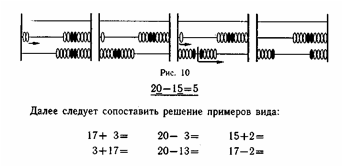 Стр. 138 Использование наглядных пособий, актуализация имеющихся знаний и опора на них помогают преодолеть эти трудности. Необходимо повторить таблицу сложения и вычитания в пределах 10. дополнение однозначного числа до десятка, вычитание из 10. Объяснение сложения не представляет ничего нового по сравне нию с объяснением решения примеров вида 13+2, кроме образова ния 1 десятка: 5+5=10 (или 1 дес.); 1 дес. + 1 дес.=2 дес.=20. ^"Рассмотрим пример на вычитание: 20—3. В числе 20 нуль единиц, а нужно вычесть 3 единицы. Занимаем 1 десяток, раздроб ляем его на 10 единиц и вычитаем 3 единицы, получаем 7 единиц. Всего остается 1 десяток и 7 единиц, или 17. Проведенное рассуж- Ш дение записывается так: 20—3=17. В случае затруднений при понимании и приема вычислений объяснение можно провести с помощью палочек, связанных н пучки. Например, 20 — это 2 десятка (берем 2 пучка палочек) и нуль единиц. Занимаем 1 десяток и раздробляем его на 10 единиц (развязываем пучок палочек). 10 единиц минус 3 единицы получается 7 единиц. Всего остается 1 десяток и 7 единиц, или 17. Решаются примеры на перестановку слагаемых, составляются по образцу, по аналогии: