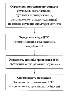 Стр. 124 На рис. 14 показан алгоритм, которым может руководствоваться педагог при формировании мотивации обучаемых к применению ИТО. В первую очередь собираются сведения о тех мотивах, которыми руководствуются обучаемые, принимая или отвергая использование предлагаемых педагогом технологий. Анализ их структуры, изучение личностных качеств обучаемых позволяют определить то, какие же внутренние потребности лежат в основе того или другого мотива. Далее педагог определяет виды ИТО, способствующие подкреплению потребностей, и выбирает способы их применения, позволяющие достигнуть целей обучения и развития. Остается самое главное – сформировать мотивацию к применению ИТО, показав обучаемому, что применение данных технологий наряду с решением задач образовательного процесса позволяет в той или иной степени удовлетворить его внутренние потребности. Рис. 14. Принцип мотивации обучаемых к применению ИТО Решение подобной задачи относится уже к области педагогического творчества, и каких-то универсальных способов решения данной проблемы не существует. Педагог в этом случае должен руководствоваться и теоретическими знаниями, и практическим опытом, и своей интуицией. Однако некоторые рекомендации, основанные на опыте применения ИТО в различных учебных заведениях, мы можем дать, они будут полезны впервые столкнувшимся с данной проблемой. Потребности безопасности. Для обучаемого с выраженной потребностью в безопасности характерен мотив стабильности, определенности, предпочтение учебы в рамках строго организованной структуры. Такие обучаемые в принципе не испытывают предубеждения к ИТО, но их могут отпугнуть возможности свободного выбора, который предоставляют многие электронные учебники. Зато они будут охотно работать с тренировочной программой, позволяющей им надежно подготовиться к контрольному испытанию. Педагог может заметить, что обучаемые с удовольствием выполняют многочисленные задания с использованием уже изученных алгоритмов, но их пугает нестандартная постановка задачи или необходимость проявить инициативу. Это нужно учитывать, подбирая контролирующую программу. Здесь будут неуместны программы, показывающие результат только после полного прохождения испытания. Более приемлемым окажется вариант опроса с непрерывной обратной связью, предполагающей, что сразу же после ответа на вопрос или выполнения задания можно узнать промежуточный результат. |