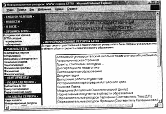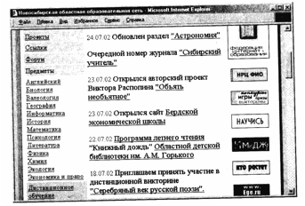 Стр. 91 В системе образования создается все больше центров телекоммуникаций – от школьных, вузовских до региональных и общероссийских. В связи с этим особую актуальность приобретает разработка научно-методологических оснований и самой технологии создания образовательного сервера в глобальной сети Internet как основы пространственно распределенной образовательной системы. Учебные заведения России в основном ведут работу в следующих направлениях. § На специализированном образовательном Web-сервере учебного заведения и серверах отдельных подразделений представляются различные учебно-методические, демонстрационные и обзорные материалы. Специалисты учебного заведения в данном случае самостоятельно определяют концепцию образовательного сервера, в рамках которой и происходит его развитие (рис. 5). § На базе региональных образовательных Web-серверов формируется информационная образовательная среда, содержательное наполнение которой осуществляется совместными усилиями педагогов различных учебных заведений (рис. 6). Рис. 5. Информационно-образовательный сайт Барнаульского государственного педагогического университета Рис. 6. Информационно-образовательный сайт Новосибирской областной образовательной сети (НООС) В рамках программы создания общероссийского виртуального образовательного пространства на местах создаются региональные центры Российского виртуального университета. И, соответственно, информация об имеющихся электронных учебных ресурсах, в том числе и из других вузов, участвующих в данной программе, становится доступной через Internet всем заинтересованным лицам – как преподавателям, так и студентам. Все региональные центры используют единую оболочку для доступа к учебным ресурсам, единственным ограничением для которых является то, что они должны быть оформлены с помощью гипертекстовой технологии. Концепция образовательного Weft-сервера. В решении многих вопросов создания пространственно распределенной образовательной системы могут играть самую активную роль и педагоги, и обучаемые. |
