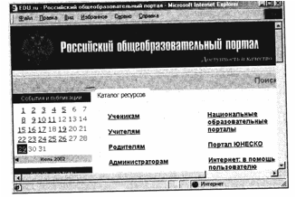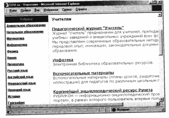 Стр. 94 В связи с многообразием и сложностью задач разработки информационной структуры для образовательных серверов естественно возникает проблема кооперации родственных учебных и научных заведений для их решения и последующего распространения удачных находок. В 2002 г. Министерством образования РФ начата реализация проекта по созданию и развитию Российского общеобразовательного портала (СНОСКА: Российский общеобразовательный портал. Адрес Internet, http://www.school.edu.ru), в рамках которого уже разработаны определенные подходы к представлению информации на образовательных сайтах (рис. 7, 8). В ходе выполнения данного проекта предполагается вести работу в следующих основных направлениях: оказывать поддержку педагогам в создании авторских сайтов, разрабатывать и внедрять стандарты, позволяющие формировать единую образовательную среду России, объединить в рамках Российского образовательного портала лучшие образовательные Web-ресурсы, ориентированные на потребности учащихся, родителей, педагогов, администрации общеобразовательных учебных заведений. Учитывая перечисленные выше задачи и определение возможных пользователей, сделаем следующий вывод: в ближайшие годы нельзя ориентироваться на обучение только через Internet. Методические материалы должны разрабатываться с прицелом на их универсальное использование – и через Internet, и в локальных сетях, и на отдельных компьютерах обучаемых, и в отдаленных учебно-консультационных пунктах и филиалах. Кроме того, само представление должно позволять легко направлять необходимые материалы по электронной почте, проводить контроль качества обучения с последующей обработкой результатов в самых разнообразных режимах: непосредственно при работе в сети с оперативной обработкой на сервере, с отсылкой результатов по электронной почте или на дискете, с последующей их обработкой и сообщением в соответствующей форме. Рис. 7. Главная страница Российского общеобразовательного портала Рис. 8. Ресурсы для учителей |
