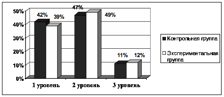 Стр. 98 1. Как Вы считаете, является ли патриотическое воспитание необходимым? 2. Как Вы считаете, сегодня семья воспитывает или не воспитывает патриотизм? 3. Как Вы считаете, нужно ли уделять в семье внимание патриотическому воспитанию детей? 4. Воспитываете ли Вы своих детей в духе патриотизма? 5. Какими методами семейного воспитания можно воспитывать патриотизм у детей? По характеру ответов родители были отнесены к одному из трех разработанных нами уровней, характеризующих специфику патриотического воспитания в семье. К первому уровню были отнесены семьи, в которых отмечается отсутствие интереса к патриотическому воспитанию. В исследуемой нами выборке к нему было отнесено 42% родителей контрольной группы и 39% экспериментальной группы. Второй уровень характеризуется представленностью в сознании родителей необходимости патриотического воспитания при недостаточных знаниях о методах и средствах такой работы. Само же семейное воспитание в целом не подвергается анализу, осуществляемые стратегия и тактика родителями не осмысливаются. К этому уровню мы отнесли 47% родителей контрольной группы и 49% родителей экспериментальной группы. Третий уровень отмечается в семьях, где патриотическое воспитание представляет собой достаточно стройную и последовательную систему воспитания с опорой на национальную историю, культуру, географию. Таких родителей оказалось 11% в контрольной группе и 12% в экспериментальной. Статистический анализ обеих выборок с вычислением моды, медианы и дисперсии выборок показал нормальное распределение данных, что позволило использовать критерий Стьюдента для последующей обработки полученных материалов. Распределение семей по специфике патриотического воспитания приведено на рисунке 4. Рис. 4. Уровни патриотического воспитания в семье до эксперимента |