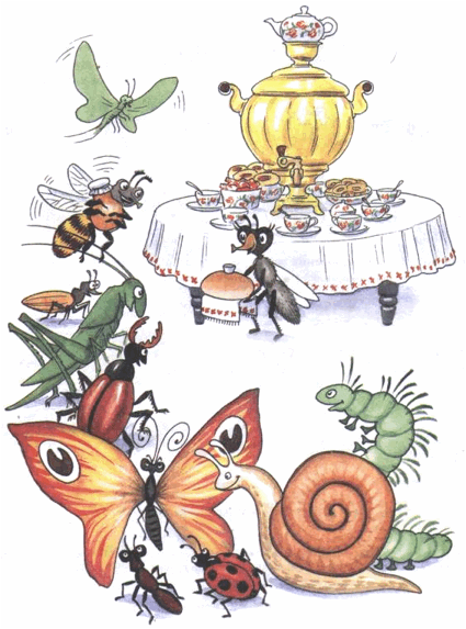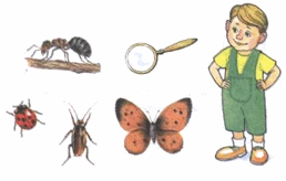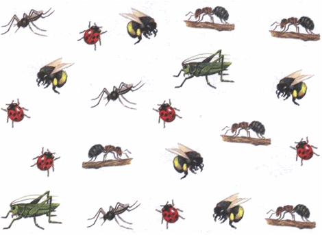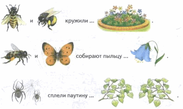 11. Упражнение «Нелепицы». Послушай предложения, расскажи, чего не бывает. А как должно быть на самом деле? Муравей живет в улье. Паук собирает нектар с цветов. Бабочка стрекочет. Муха плетет паутину. Комар ловит птиц. Шмели строят муравейник. 12. Упражнение «Составь предложения». Рассмотри картинки и составь предложения. Образец: Паутина висит между веток. 13. Упражнение «Приключения муравья». Слушай предложения и вставляй по ходу пропущенные слова-картинки (текст читает взрослый). 14. Посмотри на картинку. Назови всех насекомых. Из какой сказки они пришли? Перескажи эту сказку по памяти. |