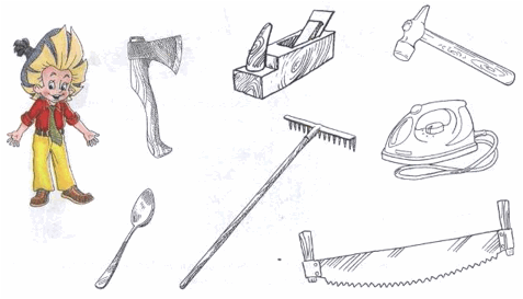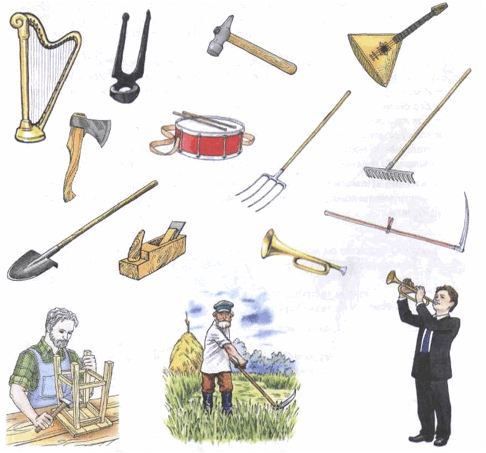 Стр. 4 10. Упражнение «Помоги Незнайке». Незнайка решил стать плотником. Но он не знает, какие инструменты понадобятся ему для работы. Помоги Незнайке. Найди и раскрась эти предметы. Тема: ИНСТРУМЕНТЫ1. Рассмотреть вместе с ребенком картинки. Познакомить его с названиями инструментов. Закрепить в словаре обобщающее понятие «инструменты». 2. Соедини желтыми линиями музыкальные инструменты с музыкантом, зелеными — сельскохозяйственные инструменты с крестьянином, а красными — плотницкие инструменты с плотником. 3. По картинкам составь словосочетания со словами новый, новая, новое по образцу. Образец: новая балалайка, новый молоток, новые грабли. 4. Упражнение «Назови ласково». Назови ласково инструменты. Грабли — грабельки Топор — ... Дудка — ... Скрипка — ... Лопата — ... Молоток — ... 5. Упражнение «Подбери действия»: Назови как можно больше слов-действий. Образец: Пилой (что делают?) — пилят, отпиливают, распиливают. Отверткой (что делают?) — ... Лопатой (что делают?) — ... Косой (что делают?) — ... Топором (что делают?) — ... Граблями (что делают?) — ... Молотком (что делают?) — ... 6. Упражнение «Музыканты». Музыканты играют на музыкальных инструментах. Назови каждого музыканта по образцу. Образец: Медвежонок играет на гармошке. Он гармонист.
