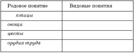 Стр. 90 Слова для справок: морко…ка, ре…ка, зя…лик, тя…ка, рома…ка, ря…чик, лопа…ка, незабу…ка. Формируемый комплекс 23: речь, сосредоточенность внимания, логическое мышление, абстрактное мышление, умение осуществлять сопоставительный анализ, формирование понятий вид – род и установление характера их взаимосвязи. Пример задания, выполняемого при изучении темы «Число имен существительных»: Заполните таблицу, подбирая к данным видовым понятиям родовые. Укажите число имен существительных. Формируемый комплекс 24: речь, устойчивость внимания, логическое мышление, абстрактное мышление, умение находить понятия одного вида, аналитико-синтетическое мышление, умение группировать. Пример задания, выполняемого в рамках темы «Число имен существительных»: Прочитайте. Напишите, объединив слова каждого номера заданий в пары по видовому признаку и изменив число имен существительных. Подчеркните орфограммы. 1) удав, заяц, крокодил, питон, кролик, аллигатор; 2) баран, корова, овца, лошадь, свинья, кабан, бык, конь. Формируемый комплекс 25: речь, устойчивость внимания, логическое мышление, умение обобщать, умение давать определения понятиям. Пример задания, осуществляемого при изучении темы «Мягкий знак на конце имен существительных после шипящих»: Вставьте в предложения-определения подходящие по смыслу слова. Составленные предложения напишите. Вставьте пропущенные буквы, раскройте скобки. Врач(ь, – ) – это …, который …. К…р…ндаш(ь, – ) – это…, которым …. Скр…пач(ь, – ) – это …, который …. Ландыш(ь, – ) – это …, который …. Формируемый комплекс 26: речь, устойчивость внимания, логическое мышление, абстрактное мышление, умение обобщать, умение устанавливать последовательность подчинения понятий. Пример задания, осуществляемого в процессе изучения темы «Число имен существительных»: Прочитайте. Разместите слова и словосочетания каждой строчки в таблице в соответствии с образцом. Укажите род и числа имен существительных. Вставьте пропущенные буквы. |