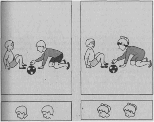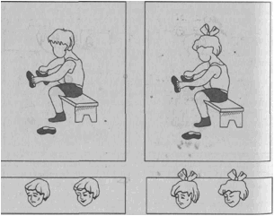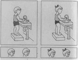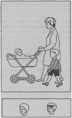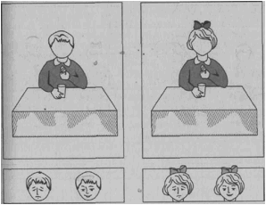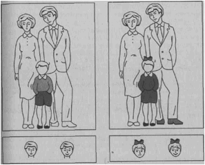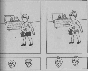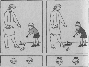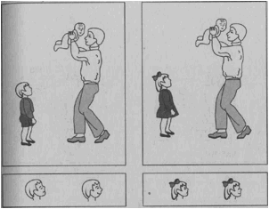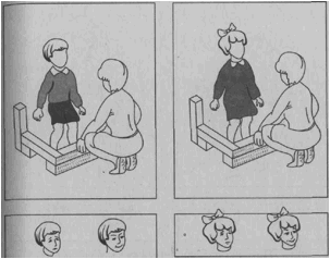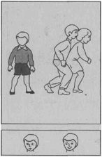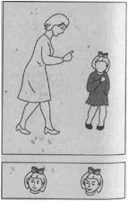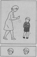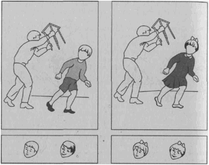 Стр. 267 Высокий уровень школьной тревожности, снижение самооценки характерны для периода поступления в школу, первых месяцев учебы. Однако после 'адаптационного периода, продолжающегося от одного до трех месяцев, положение меняется: эмоциональное самочувствие и самооценка стабилизируются. Теперь можно выделить детей с подлинной школьной тревожностью с помощью специального теста (Р.Тэммл, М.Дорки, В.Амен). Тестирование проводится после окончания первой четверти, когда у большинства детей проходит ситуативная тревога, связанная с поступлением в школу. Экспериментальный материал — 14 рисунков размером 8,5 х х 11 см. На каждом из них представлена типичная для жизни младшего школьника ситуация. Рис. 1. Игра с младшими детьми (ребенок играет с малышом). Рис. 2. Ребенок и мать с младенцем (ребенок идет рядом с матерью, которая везет коляску с младенцем). Рис. 3. Объект агрессии (ребенок убегает от нападающего на него сверстника). Рис. 4. Одевание (ребенок сидит на скамейке и надевает ботинки). Рис. 5. Игра со старшими детьми. Рис. 6. Укладывание спать в одиночестве (ребенок идет к своей кроватке, родители сидят в кресле спиной к нему). Рис. 7. Умывание (ребенок умывается в ванной комнате). Рис. 8. Выговор (мать, подняв указательный палец, строго выговаривает ребенку за что-то). Рис. 9. Игнорирование (отец играет с малышом; другой ребенок стоит в одиночестве). Рис. 10. Агрессивное нападение (сверстник отбирает у ребенка игрушку). Рис. 11. Собирание игрушек (мать и ребенок убирают игрушки). Рис. 12. Изоляция (двое сверстников убегают от ребенка, стоящего в одиночестве). Рис. 13. Ребенок с родителями (ребенок стоит между матерью и отцом). Рис. 14. Еда в одиночестве (ребенок один сидит за столом, держа в руке стакан). |