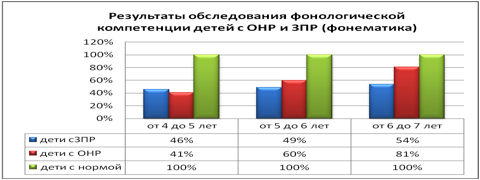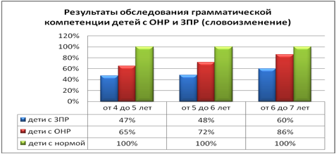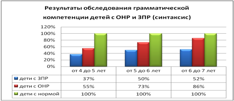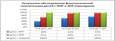 Стр. 272 Аналогично можно проанализировать и грамматический аспект речи (рис.4, 5, 6). Рисунок 5 Так, у детей 4-5 лет имеющих ОНР уровень сформированности словообразования отличается на 10% от детей с ЗПР (30% - при ОНР, 20% - при ЗПР). Рисунок 6 В возрастной период 5-6 лет уровень сформированности словообразования отличается уже на 28% (ОНР – 52%, ЗПР – 24%), в 6-7 лет разница по этому параметру составляет также 28% (ОНР – 76%, ЗПР – 48%). Уровень сформированности словоизменения у детей 4-5 лет с ОНР равен 65% по отношению к норме, у детей с ЗПР – 47% (разница 18%); у детей 5-6 лет с ОНР – 72%, с ЗПР – 48% (разница 24%), а в возрасте 6-7 лет эта разница достигает уже 26% (86% при ОНР, 60% при ЗПР). Усвоение синтаксиса детьми с ОНР происходит в два раза быстрее, чем у детей с ЗПР (ОНР с 55% до 86% (увеличилось на 31%)), (ЗПР с 37% до 52% (увеличилось на 15%)). Таким образом, мы видим, что общий уровень развития грамматической компетенции детей с ОНР значительно выше уровня детей с ЗПР. Не менее показательными являются результаты исследования фонологической компетенции детей обсуждаемой категории (рис.7, 8, 9, 10). Рисунок 7 В возрасте 4-5 лет уровень сформированности фонематики у детей с ЗПР оказался несколько выше, чем у детей с ОНР (ОНР – 41%, ЗПР – 46%). К возрасту 5-6 лет уровень сформированности фонематики у детей с ЗПР составляет 49% против 60% у детей с ОНР (равзница 11% в пользу детей с ОНР), а к возрасту 6-7 лет эта разница достигает 27% (81% при ОНР, 54% при ЗПР). Рисунок 8 Уровень усваения просодической стороны речи детей с ОНР значительно выше уровня детейс ЗПР: в 4-5 лет - разница 27% (67 – при ОНР, 40% - при ЗПР), к 5-6 годам – 35% в пользу детей с ОНР (ОНР -94%, ЗПР – 61%); а в 6-7 лет уровень развития просодической стороны речи ребенка с ОНР фактически достигает нормы – 97%, тогда как у ребенка с ЗПР – 72% (разница 29%). |