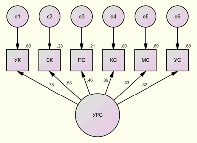 Стр. 6 Выделенная выше факторная структура была подтверждена с помощью конфирматорного факторного анализа в модуле AMOS [13] (см. рис.6). В отличие от эксплораторного (разведочного) анализа, как метода определения структуры соотношений между множеством переменных, с помощью конфирматорного (подтверждающего) анализа проверяется, в какой степени предполагаемая факторная структура объясняется данными. Если данные хорошо объясняют модель, то значимых различий между ними и предполагаемой факторной моделью не будет. В противном случае факторная модель объясняет исходные данные неадекватно. Для определенного набора данных возможно построение множества факторных моделей, поэтому конфирматорный анализ часто сводится к задаче сравнения конструктов между собой с целью найти наиболее адекватный [11]. В нашем случае соответствие модели эмпирическим данным мы устанавливали на основании индексов: значения по критерию χ² (как правило, он должен быть статистически незначим на уровне p > 0,05), сравнительного индекса пригодности CFI (индекс должен превышать 0,90) и среднеквадратичной ошибки аппроксимации RMSEA (индекс не должен превышать 0,1) [14]. Обозначения: УРС – устойчиво-рациональный стиль поведения; УК – устойчивость к конфликту, СК – самооценка рационального поведения в конфликте, КС – компромиссный стиль, МС – мягкий стиль, УС – уходящий стиль, ПС – примиренческий стиль. χ² (9) = 16,393, p = 0,059; CFI = 0,915; RMSEA = 0,168 Рис. 6. Факторная модель Анализ пригодности модели выявил удовлетворительное соответствие модели эмпирическим данным исходя из того, что значение χ² статистически не значимо (p = 0,059 > 0,05), сравнительный индекс пригодности CFI > 0,90. Однако среднеквадратичная ошибка аппроксимации RMSEA > 0,10. Корреляционный анализ выше описанных переменных и показателей, полученных по методике диагностики реальной структуры ценностных ориентаций личности, позволил выявить следующие значимые связи: ценность «наслаждение прекрасным» коррелирует со шкалой «компромиссный стиль» (r = 0,406, p < 0,05) и «мягкий стиль» (r = – 0,456, p < 0,05). Мягкий стиль конфликта в свою очередь коррелирует с ценностью «высокий статус» (r = 0,368, p < 0,05), а жесткий стиль – с ценностью «здоровье» (r = 0,368, p < 0,05). |